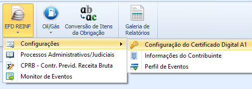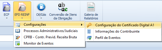 A tela está disponível em Obrigações > EFD Reinf > Configuração do Certificado Digital A1.