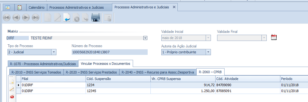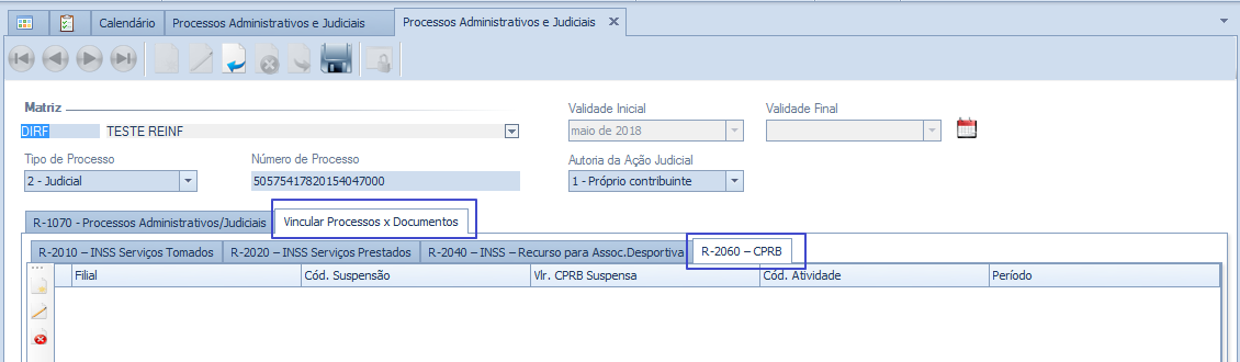 Disponibilizada a aba R-2060 CPRB na tela de Processos Administrativos e Judiciais dentro da aba Vincular Processos x Documentos.