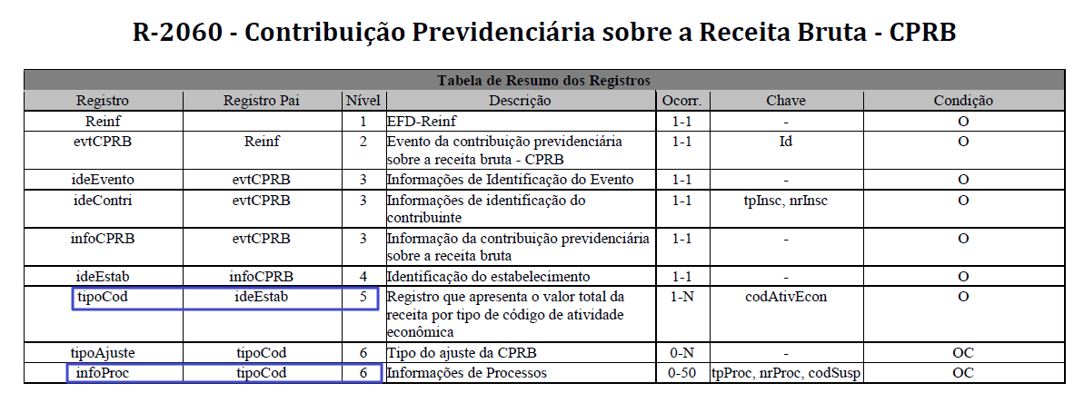 De acordo com o leiaute do evento R-2060, o grupo infoProc - Informações de Processos está abaixo do grupo tipoCod – Registro que apresenta o valor total da receita por tipo de código de atividade econômica.