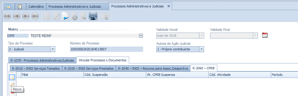 Clicar em Novo e preencher os campos da aba R-1070 – Processos Administrativo/Judicial e depois ir para a aba Vincular Processos x Documentos > R-2060 CPRB