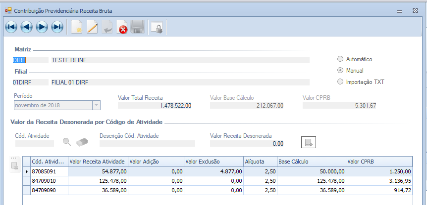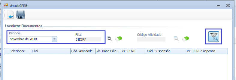 Para que as informações sejam demonstradas na tela Vinculo CPRB é necessário primeiramente preencher a tela CPRB – Contr. Previdenciária Receita Bruta
