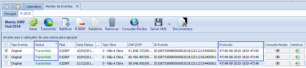 Quando o processo de consulta recibo é finalizado com sucesso o status dos eventos ficará como Transmitido e a coluna Protocolo será preenchida com o número do recibo.