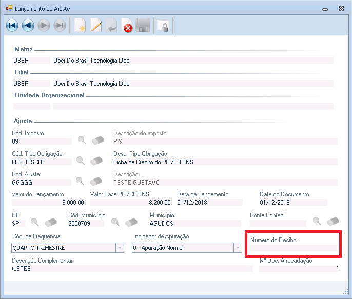 Descrição da Nota: Desenvolvimento do campo Número do Recido para a tela de Lançamento de Ajuste.