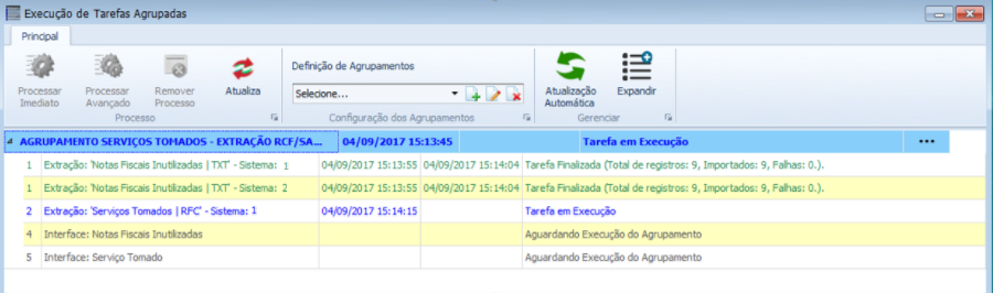 A Tela de Tela Execução de Tarefas Agrupadas será Exibida, nesta tela é possível acompanhar a Execução das tarefas agrupadas, e visualizar o log de Execução do Agrupamento.