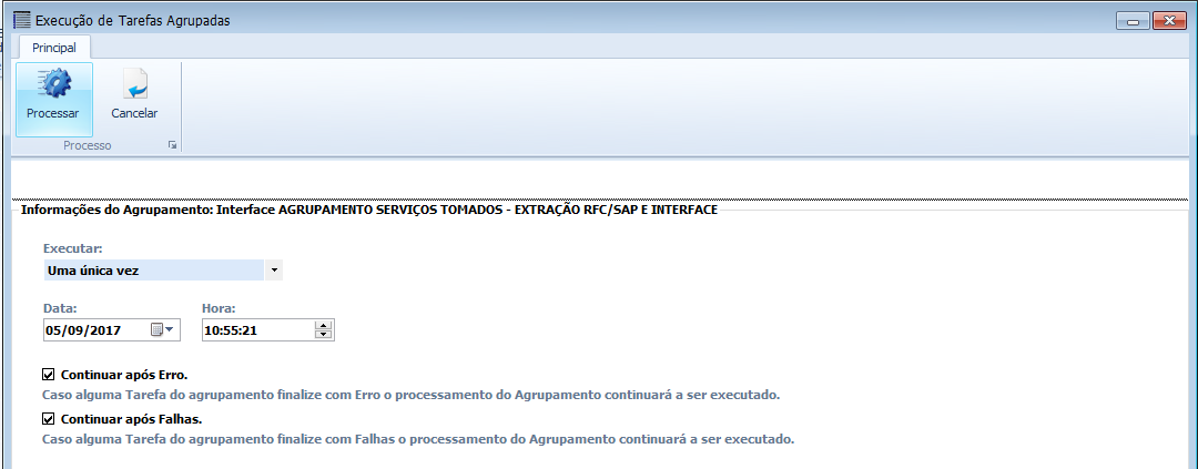 Após criar os agrupamento, para executa-los basta clicar no botão “Processar Imediato” ou criar agenda através do Botão “Processar Avançado”, onde serão exibidos os controles para definição do agendamento e a o Parâmetro “Continuar após Erro” que é utilizado para informar se o processo de Agrupamento deverá ser abortado, juntamente com as demais tarefas agrupadas, em caso alguma tarefa seja finalizada com erro; e o Parâmetro “Continuar após Falha” que é utilizado para informar se o processo de Agrupamento deverá ser abortado, juntamente com as demais tarefas agrupadas, em caso alguma tarefa possuam Falhas, Observações ou na sua finalização necessite de Veficação do Log.