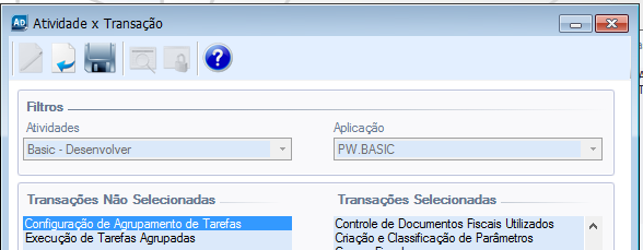 Nas telas "Atividade x Ação" e "Atividade X Transação".