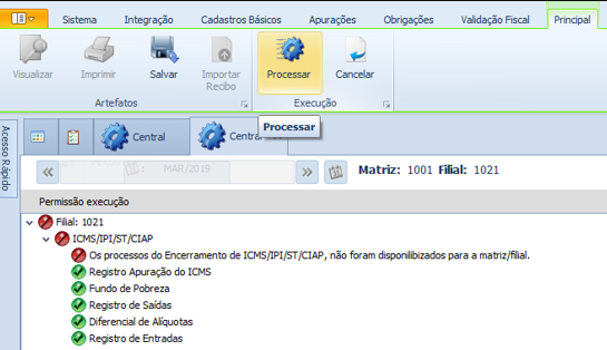 "Os processos de Encerramento de ICMS/IPI/ST/CIAP, não foram disponibilizados para a matriz/filial."