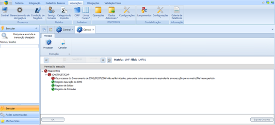 "Os processos de Encerramento de ICMS/IPI/ST/CIAP não serão iniciados, pois existe outro encerramento equivalente em execução para a matriz/filial nesse período."