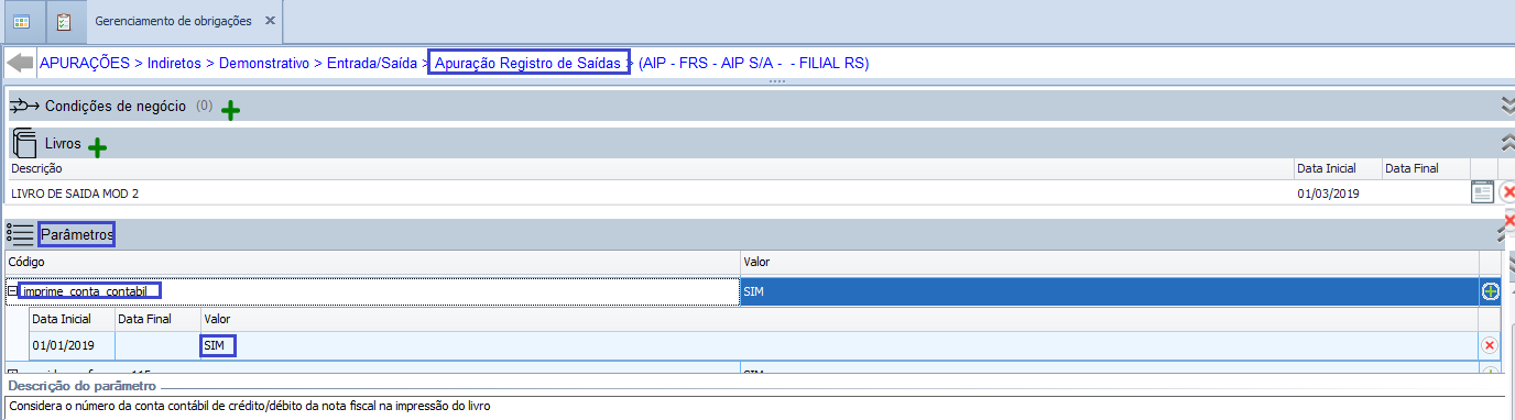 As contas contábeis serão escrituradas somente se o parâmetro “imprime_conta_contábil” for definido como SIM: