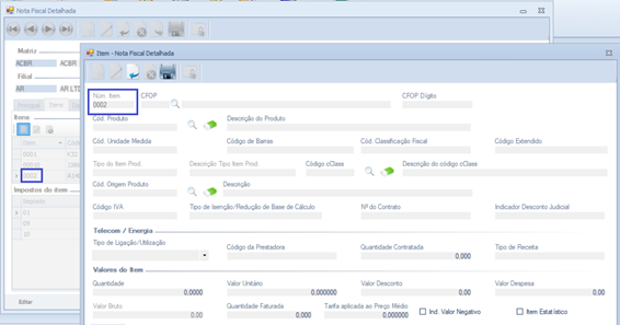 Exemplo: A Nota Fiscal do exemplo a seguir já apresentava um item de número 0002 na Nota Fiscal e, ao realizar a inclusão de um novo item, terminava por repetir o mesmo número de sequência.