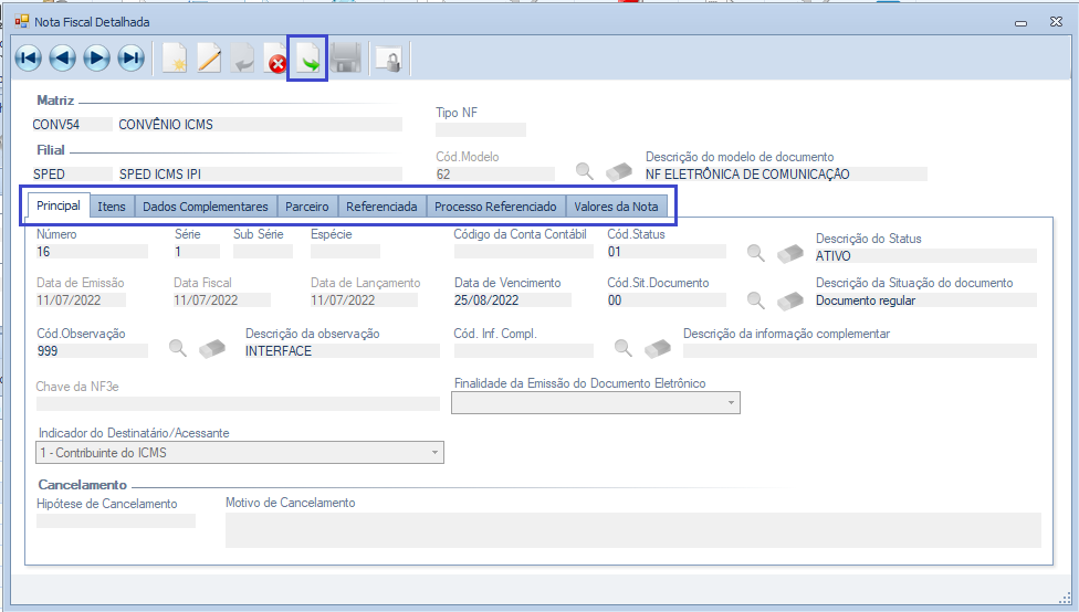 Ao clicar no botão COPIAR, todas as informações das abas Principal, Itens, Dados Complementares, Parceiro, Referenciada, Processo Referenciado e Valores da Nota serão copiadas habilitando-as para edição e, em seguida, para salvar o documento.