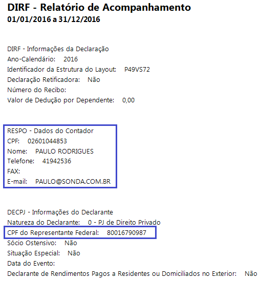 Os representantes considerados na DIRF, nos registros RESPO e DECPJ são o Contador e o representante legal Federal.