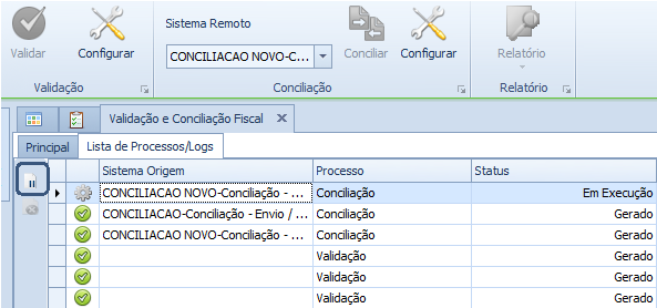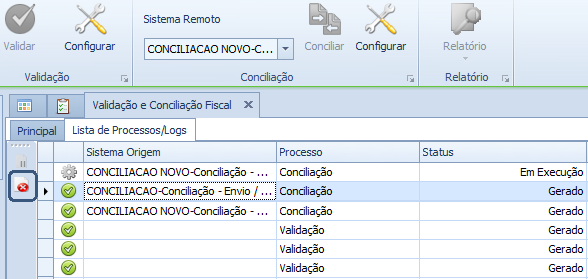 1 - Na Validação e Conciliação Fiscal, os botões Suspender e Excluir da aba Lista de Processos/Logs foram retirados da parte de cima da tela e agora são demonstrados ao lado esquerdo da Lista.