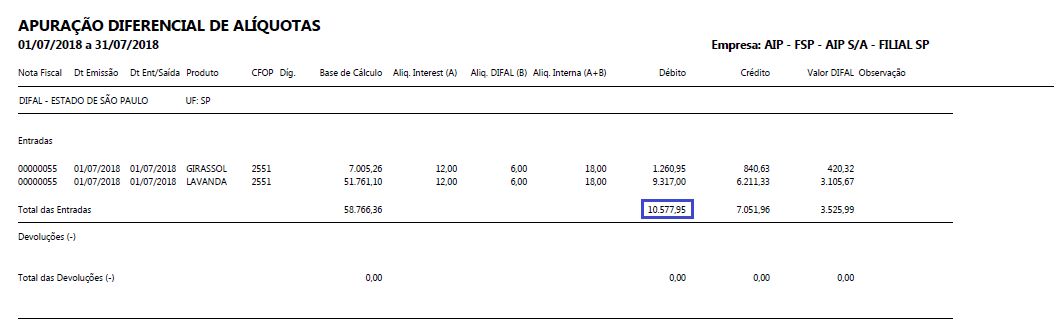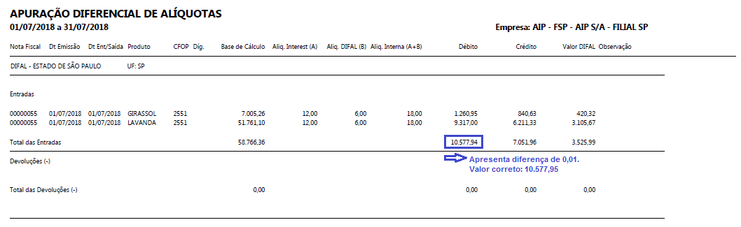 Exemplo: Apuração do DIFAL-SP gerada antes da correção: