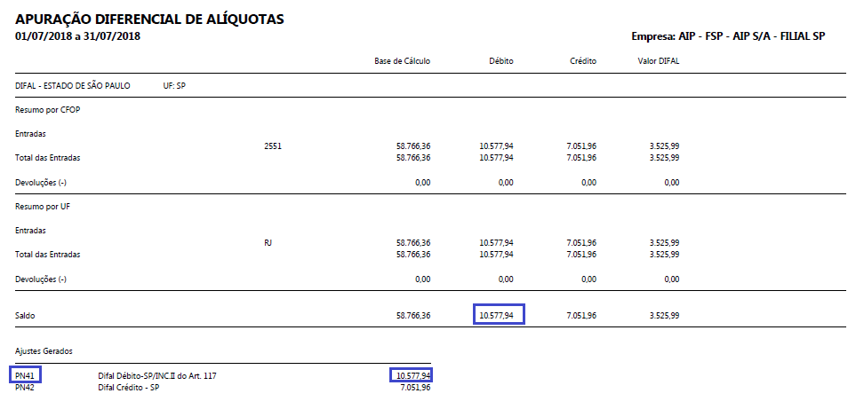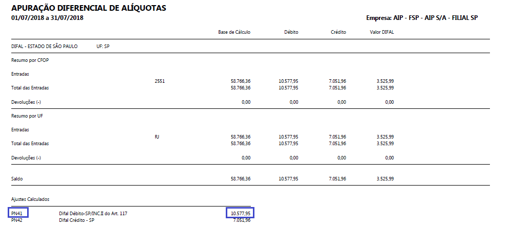 Foi efetuado tratamento para não apresentar diferença de valores na apuração do DIFAL SP e na geração ajuste PN41-Difal Débito-SP/INC.II do Art. 117.