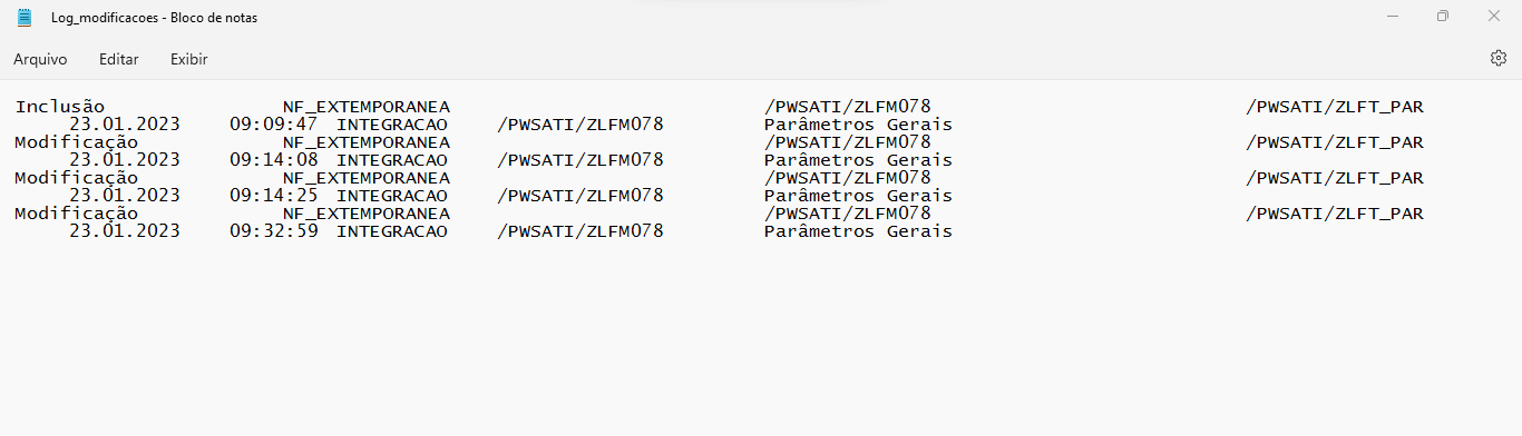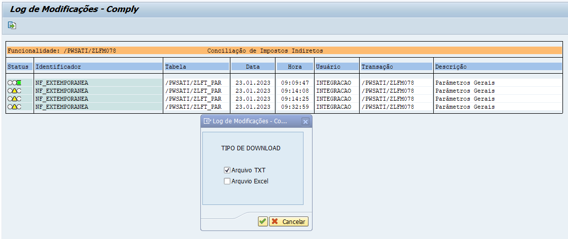 Para essa nota, estamos liberando a opção de ‘Download’ do Log apresentado na geração do Extrator Log de Modificações (/PWSATI/ZLFM720) como arquivo ‘TXT’ ou ‘Excel’.