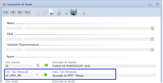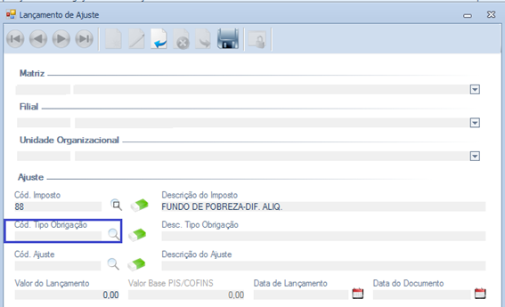 Na tela Lançamento de Ajuste ao selecionar o Imposto 88 (Fundo de Pobreza-Dif. Aliq), estava apresentando erroneamente o Cód. Tipo Obrigação.