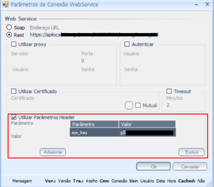 Componente Execução da Interface: Evolução para conector WebService, foi incluso em sistemas remotos um componente que permite passar parâmetros no herder da conexão: