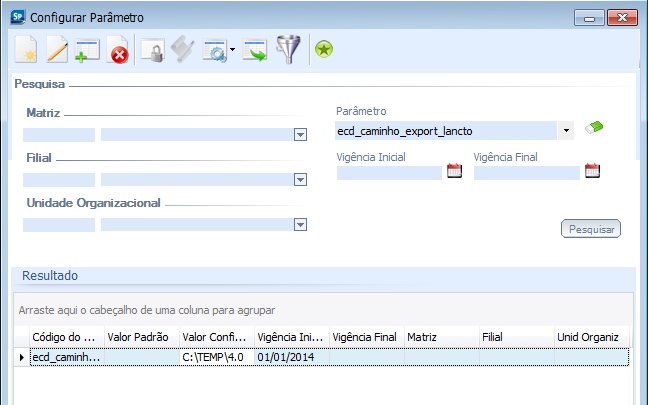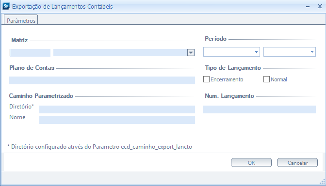 IMPORTANTE: Antes de exportar as partidas em arquivo.txt será necessário informar em qual diretório o arquivo.txt será salvo. Através da Tela Parâmetros (Configurar\Parâmetros), selecionando o Parâmetro <ecd_caminho_export_lancto>.