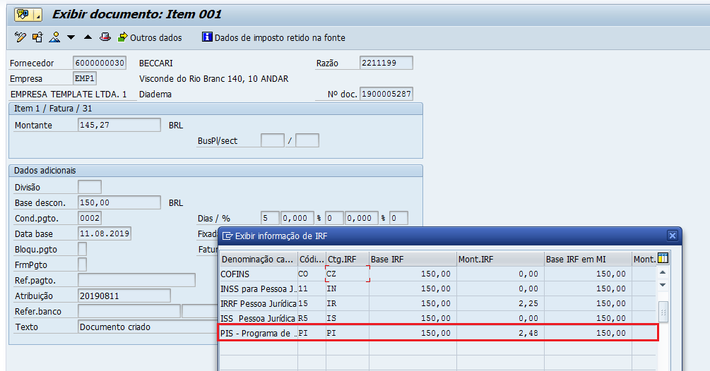 - Segue uma exemplificação => documento contábil 1900005287 com o imposto 59 (compensado):