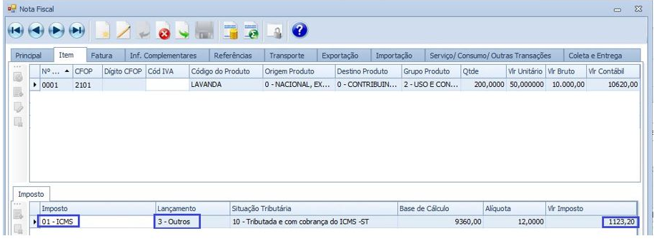 Irá considerar o valor do imposto 01-ICMS, com tipo de lançamento 3-Outras, destacado no item da NF, com base no artigo 271 do RICMS/SP, que dispõe que trata-se do valor do ICMS da Operação Própria.