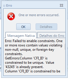 Erro: Failed to enable constraints. One or more rows contain values violating non – null, unique, or foreign – key constraints.