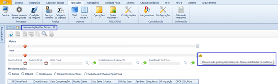 Mensagem: Usuário não possui permissão nas filiais cadastradas no sistema.