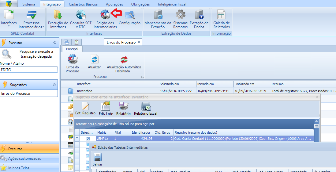 O acesso a Tela no Comply pode ser realizado clicando no Botão “Edição das Intermediarias” no Menu ou através do atalho digitando:” Erros do Processo” ou “EDITG”;