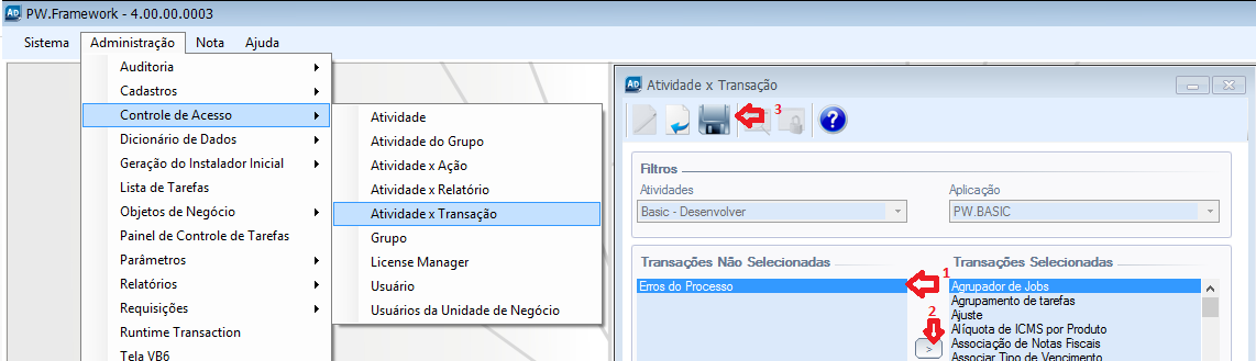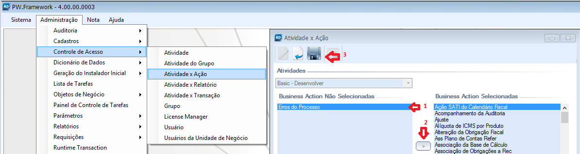 Para acesso a Tela é necessário associa-la a lista de atividade do Grupo, nos Controles de acesso Atividade x Ação e Atividade Transação: