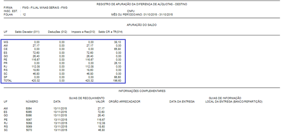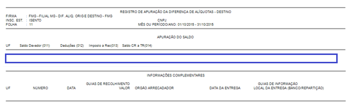 Página de Apuração do Saldo da Dif. Aliq. Destino: