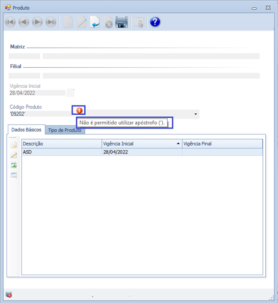 Melhoria realizada na tela ‘Produto’, não permitindo o uso do apóstrofo no campo ‘Código Produto’.