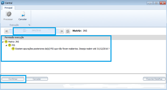 Na tela da Central permitirá abertura de período em massa. Quando houver a necessidade de utilizar esta funcionalidade, será necessário selecionar o período desejado, o sistema apresentará a mensagem 'Deseja reabrir até 31/12/XXXX'. Clicar o botão Confirmar, e a execução será realizada (ver figura abaixo).