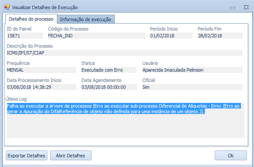 “ Falha ao executar a árvore de processos (Erro ao executar sub processo Diferencial de Alíquotas - Erro: (Erro ao gerar a Apuração do DifalReferência de objeto não definida para uma instância de um objeto.)).”