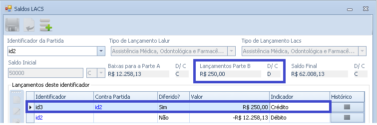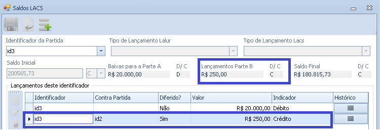 Na contra partida também é demonstrado o lançamento como foi efetuado: Partida a crédito no id3 e a débito no id2. O grid demonstra o lançamento da partida, como foi efetuado, a parte superior da tela indica como foi gravada a contra partida: