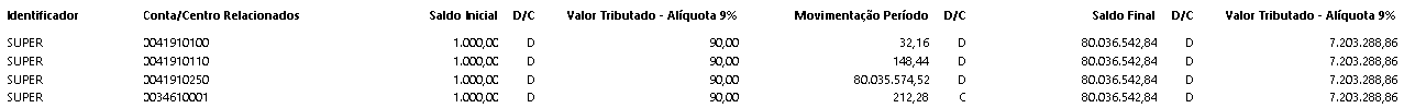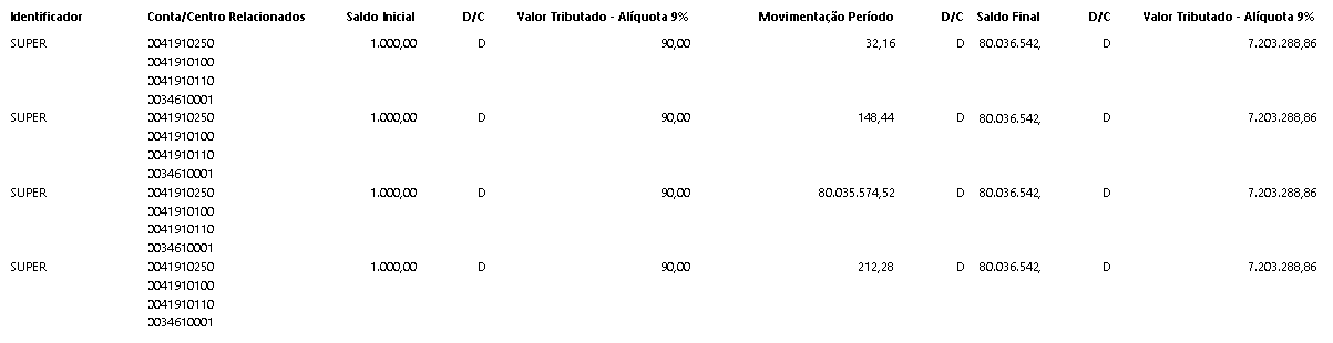 Quando existitam baixas a partir de contas contábeis, o relatório gerava um bloco de informações para cada conta demonstrando valor para a primeira conta encontrada em cada grupo, indevidamente:
