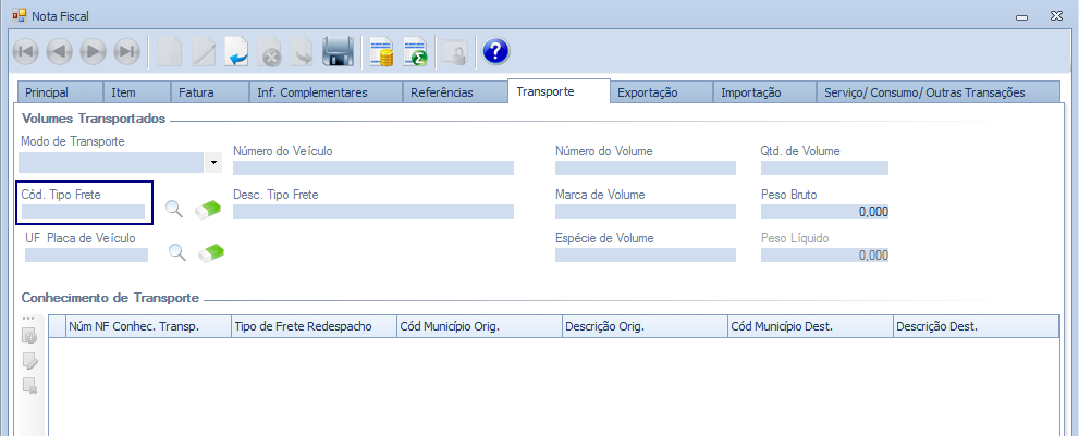 Neste campo, será apresentada a informação do campo "Cód. Tipo Frete" da aba "Transporte" da tela de Nota Fiscal.
