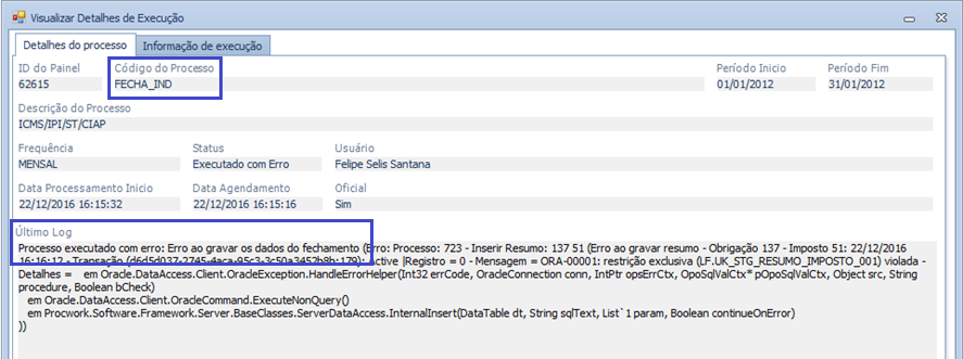 Mensagem: "Processo executado com erro: Erro ao gravar os dados do fechamento..."