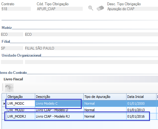 Parametrização: Livros Modelo C e RJ no contrato APUR_CIAP.