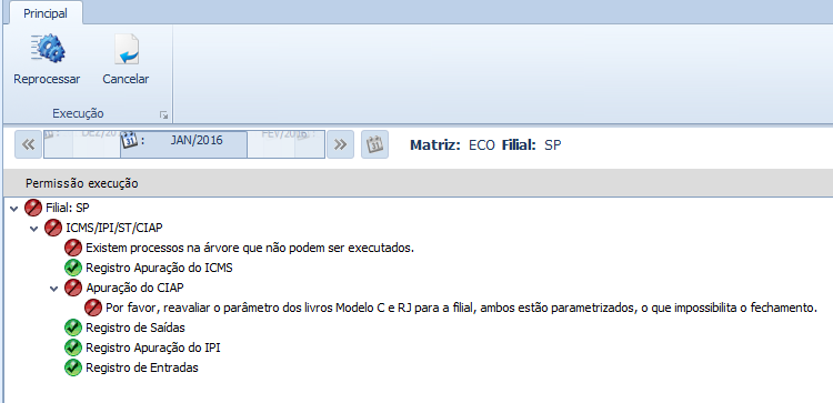 Mensagem: “Por favor, reavaliar o parâmetro dos livros Modelo C e RJ para a filial, ambos estão parametrizados, o que impossibilita o fechamento”.