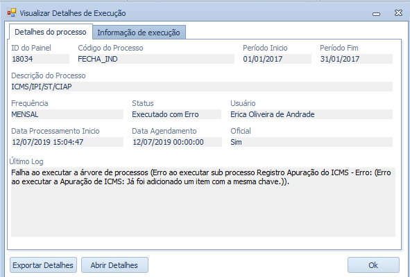 Erro: Falha ao executar árvore de processos (Erro ao executar sub processo Apuração Registro Apuração de ICMS – Erro: (Erro ao executar a Apuração de ICMS: Já adicionado um item com a mesma chave.))