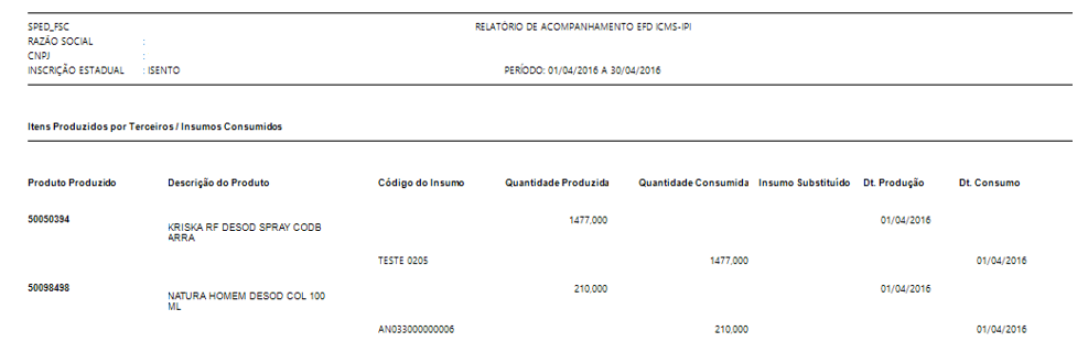 K250 e K255 – Itens Produzidos por Terceiros / Insumos Consumidos