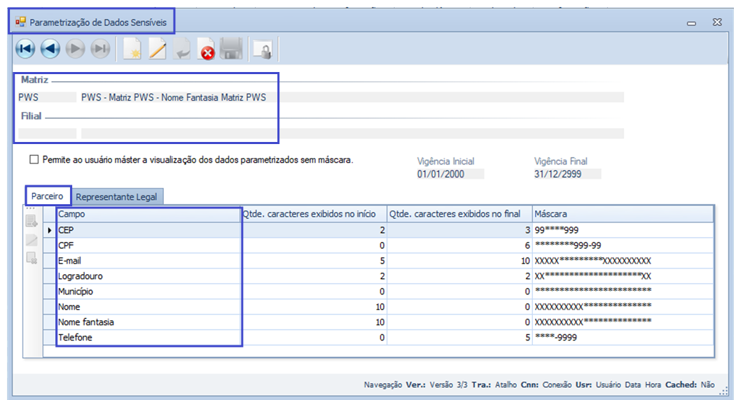Os dados na aba Parceiro também serão apresentados com a máscara parametrizada na tela Dados Sensíveis.