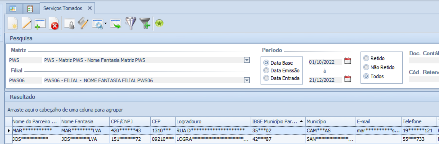 Descrição da Nota: Melhoria no grid de pesquisa e na tela de Serviços Tomados, a fim de que reflitam as adequações da Lei de Proteção dos Dados Pessoais, nº 13.709 - LGPD.