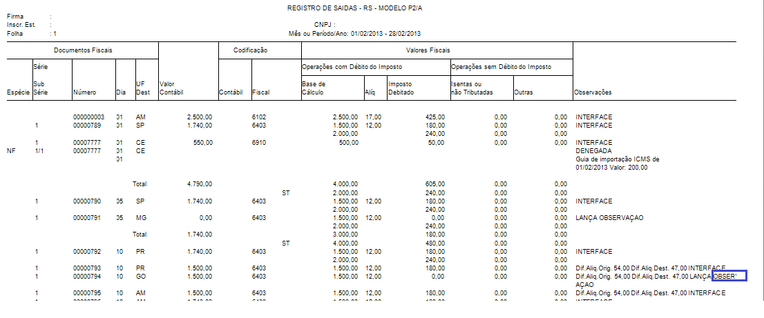 Feito tratamento no Livro Registro de Saídas (MOD2 e MOD2A), para demonstrar corretamente a descrição no campo de Observações, na visualização via tela e impressão via PDF.