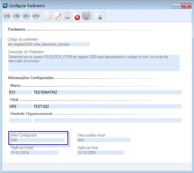 Sendo assim, foi disponibilizado o parâmetro “efd_registro0200_cifra_descricao_produto” na tela: Configuração de Parâmetros. Quando estiver configurado com SIM, no campo 03 (DESCR_ITEM) do registro 0200 será apresentado o código do item, ao invés da descrição do produto.