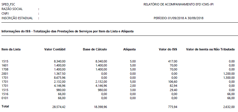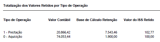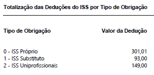 No final, os valores são totalizados por Tipo de Obrigação: 0 - ISS Próprio, 1 - ISS Substituto ou 2 - ISS Uniprofissionais.