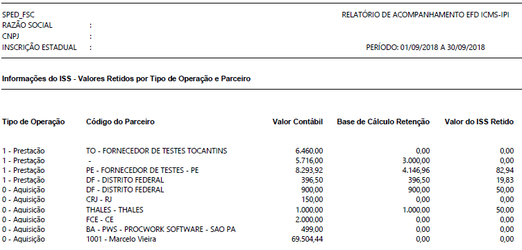 Este quadro corresponde aos valores de entrada demonstrados no registro B440, agrupados por Tipo de Operação e Código de Parceiro. É composto pelas colunas: "Tipo de Operação", "Código do Parceiro", "Valor Contábil", "Base de Cálculo Retenção" e "Valor do ISS Retido".