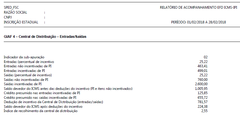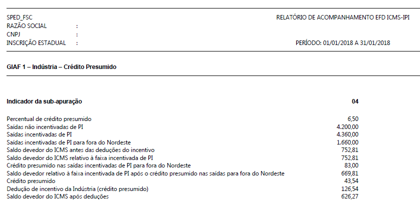 Este quadro corresponde aos valores demonstrados no registro 1980. Serão exibidos por Indicador da sub-apuração que é o mesmo agrupamento do registro 1970. Todos os valores do registro serão apresentados no relatório de acompanhamento, conforme abaixo: