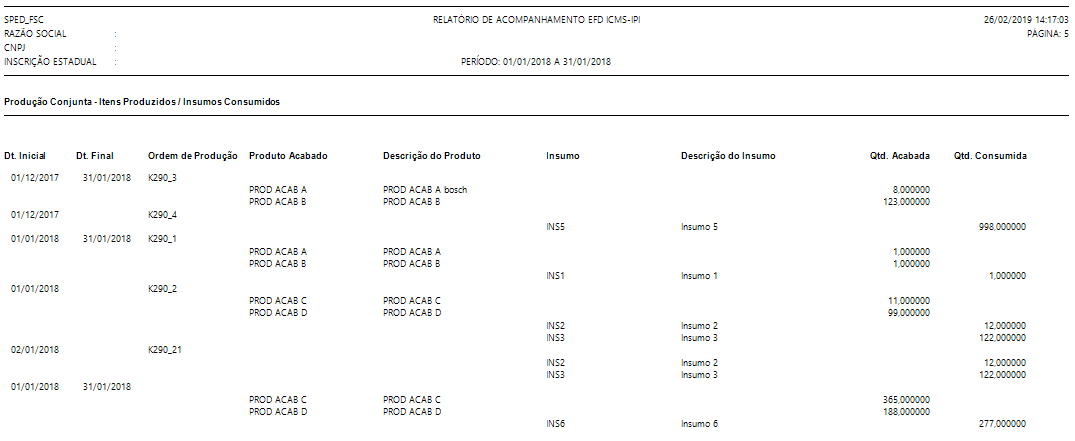 Este quadro correspondente aos registros K290, K291 e K292 demonstrados no EFD ICMS/IPI. É composto pelas colunas "Data Inicial e Final", "Ordem de Produção", "Produto Acabado", "Descrição do Produto", "Insumo", "Descrição do Insumo", "Quantidade Acabada" e "Quantidade Consumida".