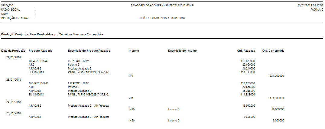 Este quadro correspondente aos registros K300, K301 e K302 demonstrados no EFD ICMS/IPI. É composto pelas colunas "Data da Produção", "Produto Acabado", "Descrição do Produto Acabado", "Insumo", "Descrição do Insumo", "Quantidade Acabada" e "Quantidade Consumida".